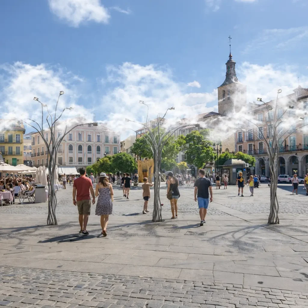In low-humidity climates, evaporative cooling operates at peak efficiency. MISTREE delivers meaningful temperature reduction in exposed plazas, boulevards, and civic spaces — creating cooler microclimates with minimal water and power use.